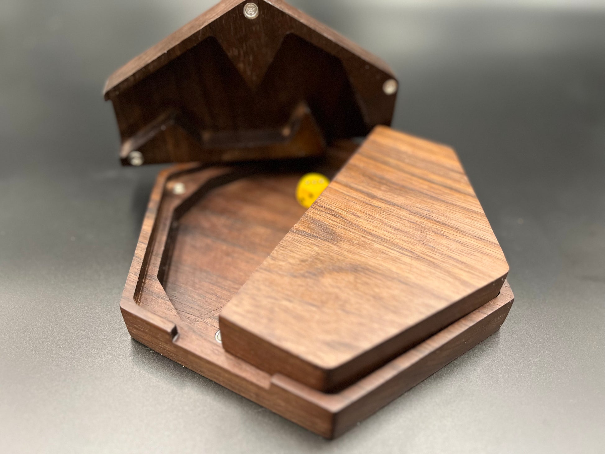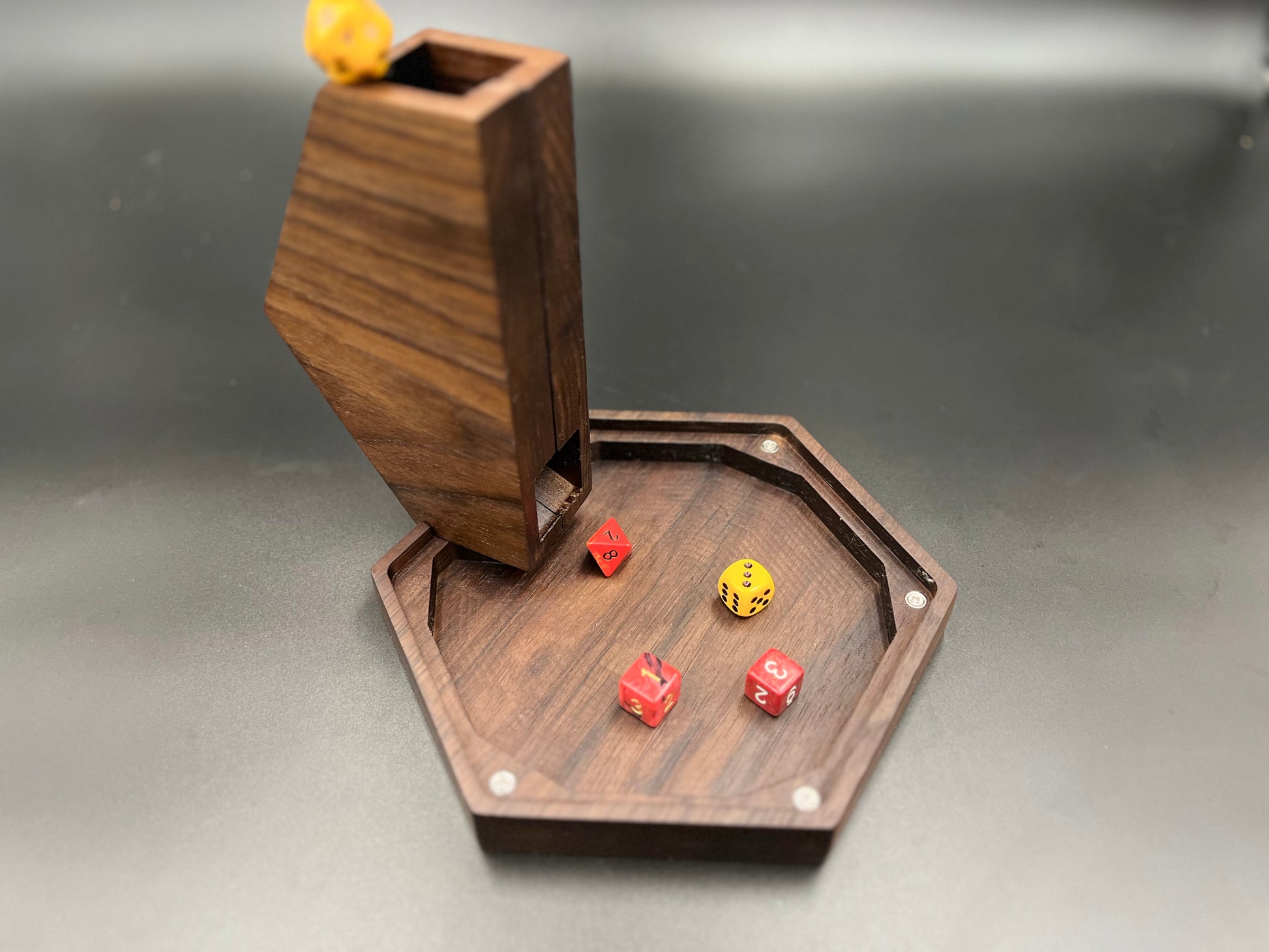This elegant dice tower is a mid-sized dice roller designed to randomize your dice action while looking sekz on the table. It comes in two shapes, circle and hex (though, honestly, we'd shape it like a pig if you asked for it to be shaped like a pig. We'd charge you a little more but, "Hey! Who wants a pig dice tower???).